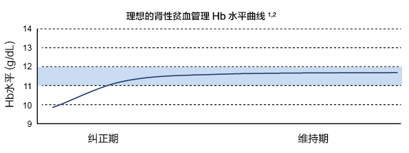 糾正期:平穩(wěn)升高Hb水平,在4個月內(nèi)使Hb水平平穩(wěn)達標。在此期間,Hb水平的靶目標范圍為11-12 克/分升,最高不能超過13 克/分升。由于Hb水平上升過快可對患者臨床預后造成明顯的不利影響,因此Hb水平上升速率應(yīng)控制在1-2 g/dL/月范圍內(nèi),且使患者Hb水平糾正至達標水平所需的時間控制在4個月內(nèi)。