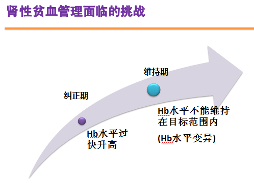 中華醫(yī)學會腎臟病學分會2010年版《重組人促紅細胞生成素在腎性貧血中合理應(yīng)用的專家共識》和2004年《歐洲慢性腎衰竭患者貧血治療最佳實踐指南》均指出,在為期4個月的糾正期內(nèi)平穩(wěn)升高Hb水平,在維持期內(nèi)使Hb水平持續(xù)穩(wěn)定在目標范圍內(nèi)是理想的腎性貧血管理治療目標(這里下劃線內(nèi)容講解的同時,曲線動態(tài)上升)。這里強調(diào)了兩個關(guān)鍵的要點:糾正期應(yīng)使Hb水平緩慢平穩(wěn)上升,避免Hb水平過快升高;維持期應(yīng)使Hb水平持續(xù)保持在11-12克/分升的目標范圍內(nèi),維持Hb水平持久穩(wěn)定。(這里在對應(yīng)的時候動畫加上色塊及相應(yīng)的內(nèi)容)